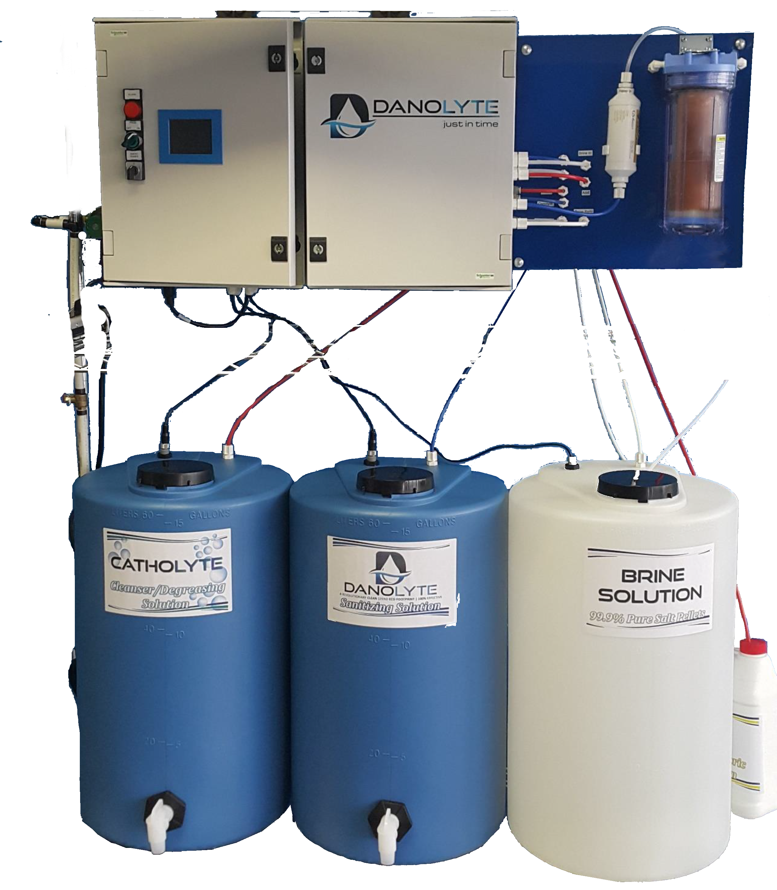 The SCIENCO DANOLYTE “JUST IN TIME” system is composed of an Electrical Cabinet and a Hydraulic Cabinet. The system uses an electrolytic cell to activate a brine solution.